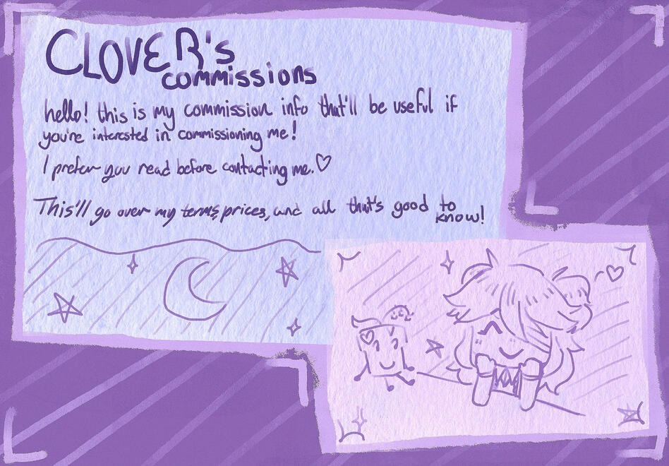 Please do not request any sort of NSFW art from me, fetish art, NFT's, anything of that sort. I am not able to provide this content and will not unless stated directly and clearly otherwise, and by my own choice. I will not be convinced to draw anything I am uncomfortable with.
